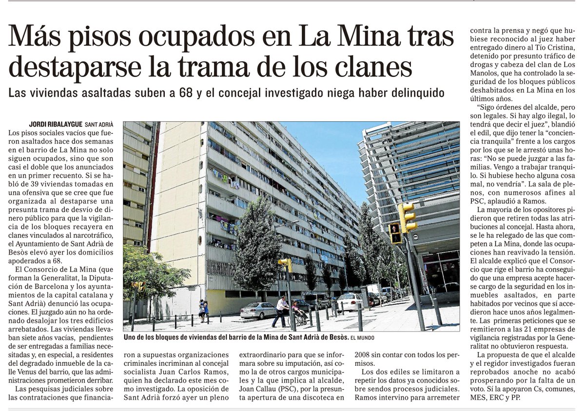 Dues setmanes després del inici de les ocupacions, el periodista Jordi Ribalaygue publicava a El Mundo l'article "Más pisos ocupados en La Mina tras destaparse la trama de los clanes". En ell, explicava que "el jutjat encara no havia ordenat desatllotjar els tres edificis arrabassats". A més, puntualitzava que les vivendes feia set anys que estaven buides.