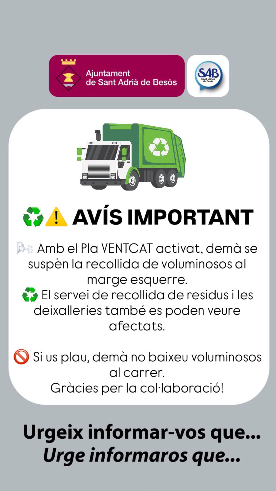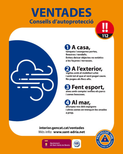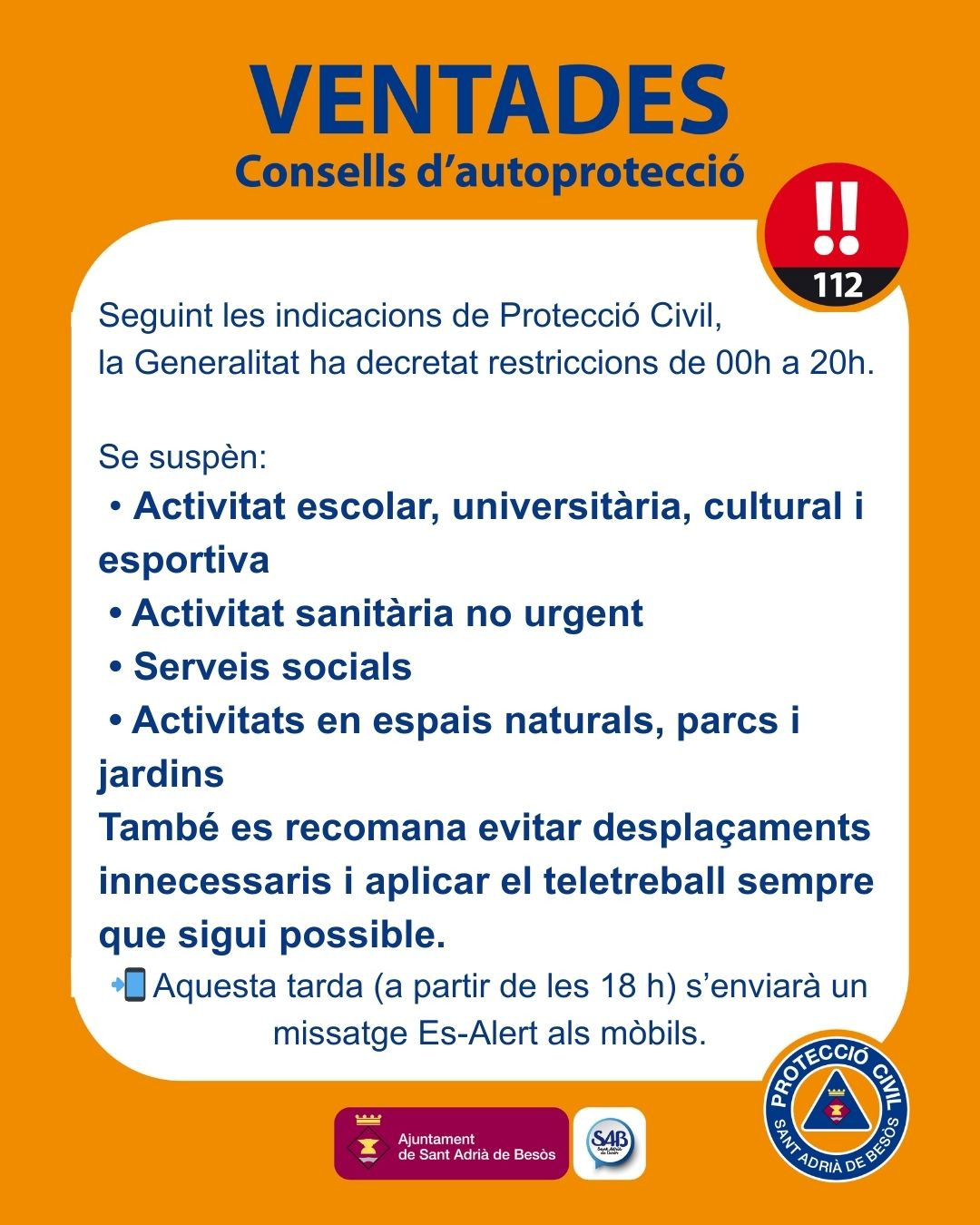 L’ajuntament de Sant Adrià de Besòs ha emès una sèrie de comunicats i recomanacions per a la població en què es recomana, sobretot, evitar els desplaçaments innecessaris i es demana, sempre que sigui possible, aplicar el teletreball. Finalment, també avisa que la recollida de residus es pot veure afectada per la situació de fort vent i es demana actuar en conseqüència i responsabilitat.