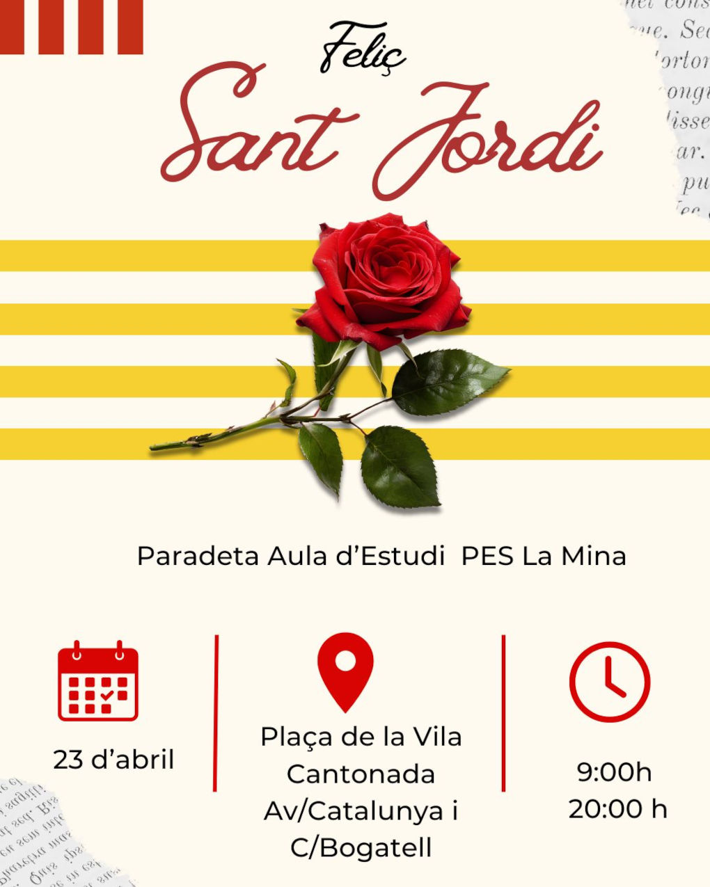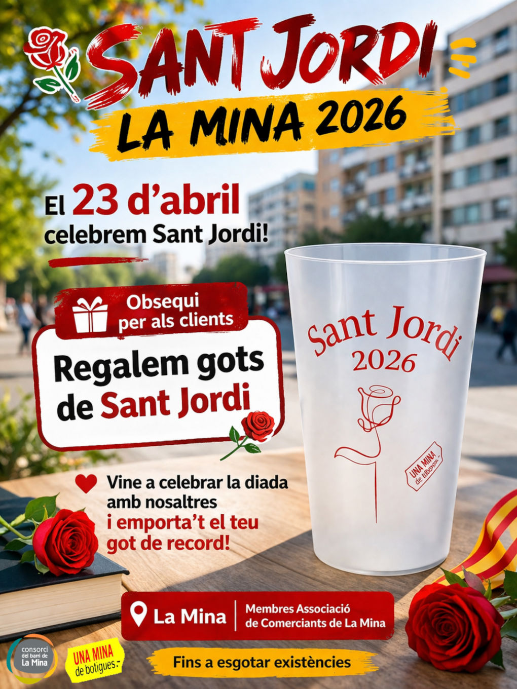 A aquesta banda del riu, a la Plaça de Maria Àngels Rosell de La Mina, hi haurà també una paradeta organitzada per Les Adrianes, que compartiran artesanies i roses de paper. Per altra banda l’Associació de Comerciants de La Mina obsequiarà la clientela dels comerços amb gots reutilitzables estampats amb elements decoratius de Sant Jordi (fins a esgotar existències), mentre que l’Associació de Veïns i Veïnes obrirà les seves portes i obsequiarà amb roses qui els visitin.